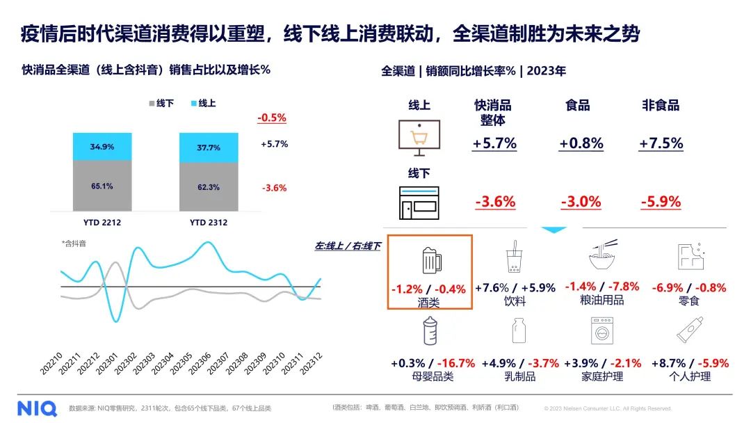 根据2023年市场数据显示,线上渠道部分呈现出较为显著的增长趋势,增长率达到了5.7%。相比之下,快消品线下部分的表现略显疲软,下滑幅度为3.6%。由于线下市场依然占据超过六成的市场份额,因此整体快消品全渠道呈现出基本持平或轻微下滑的态势。