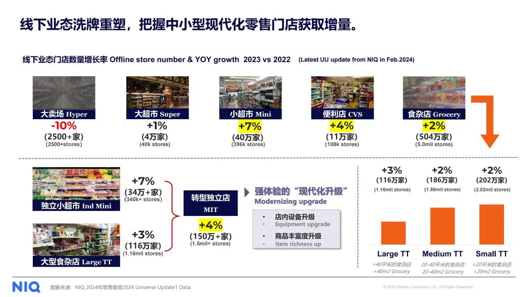 通过数据监测发现,市场形势变化,大型渠道销售下滑,门店扩张减缓。相反,小型渠道如便利店和食杂店出现增长。而小型渠道如便利店、食杂店开始增长,成为市场增长主力,对渠道下沉有积极作用。小型化渠道可能具有更大的发展潜力和市场空间。
