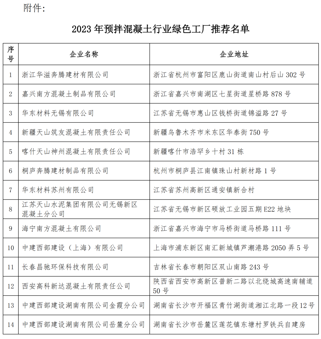 附件:2023年预拌混凝土行业绿色工厂推荐名单