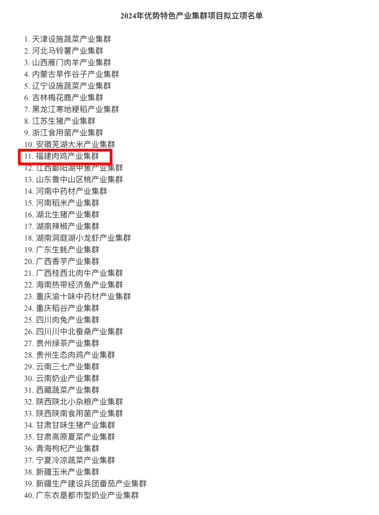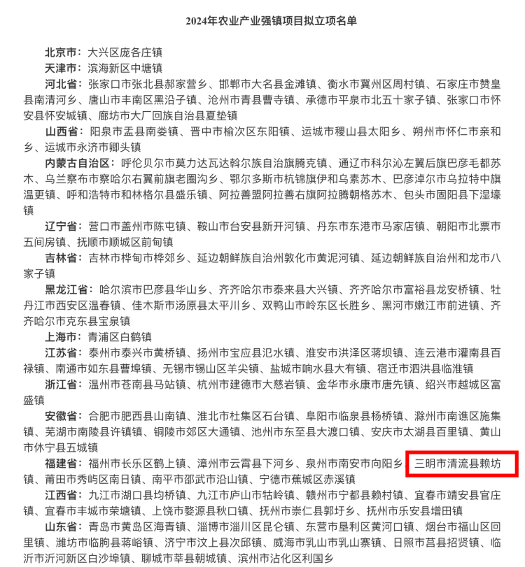 4月1日,农业农村部发布《2024年农业产业融合发展项目立项名单公示公告》,我市清流县赖坊镇获批创建国家农业产业强镇,泰宁县列入福建肉鸡产业集群项目县。