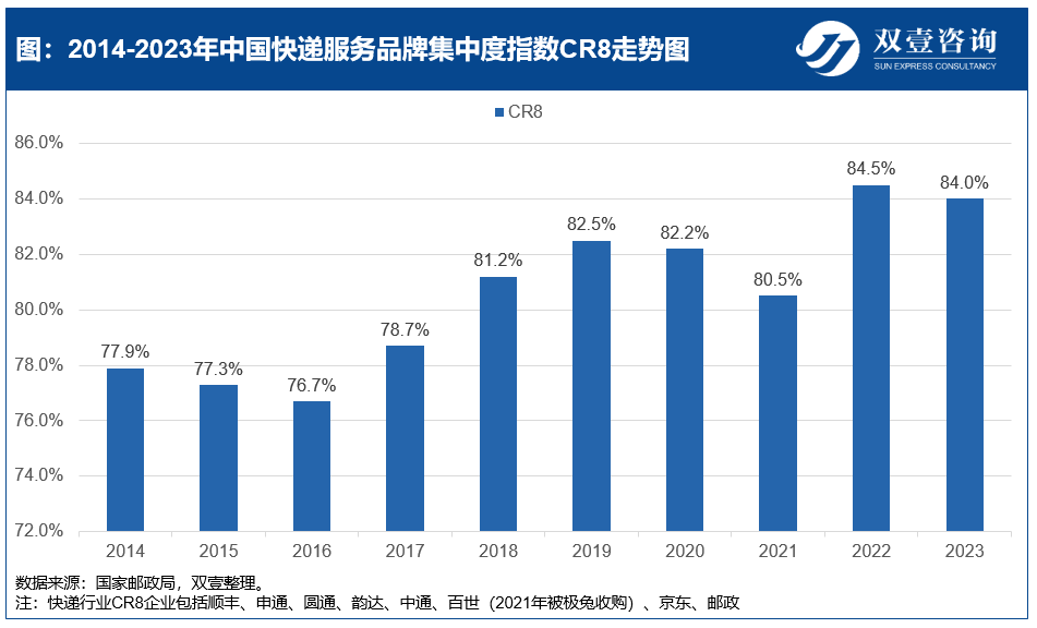 从行业整体上来看,中国快递行业的集中度经历了波动变化,从新进入者涌入到整合期再到新玩家的加入,最终形成了头部企业实力显著增强的格局。根据快递服务品牌集中度指数CR8来看,2014-2016年快递市场不断涌入新进入者,导致市场集中度下降。2017年后行业进入了整合期,价格战竞争激烈,部分中小企业被迫退出市场,集中度逐渐攀升。2020年开始,极兔等新玩家入局,促进行业集中度进一步下降。2022年,受并购重组等因素影响,中国快递行业集中度高达到84.5%,头部快递企业均已登陆资本市场,公司实力显著增强。