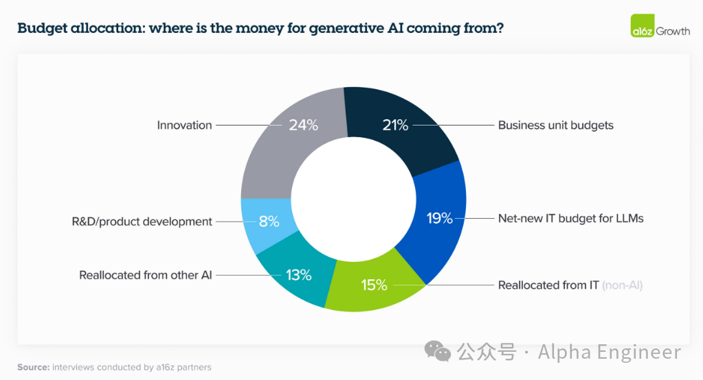 为了撰写这份报告,a16z的分析师采访了近百名世界五百强企业领袖,了解他们对于生成式AI技术的展望、应用落地规划、采购预算制定、开闭源模型偏好等关键问题的态度与选择。