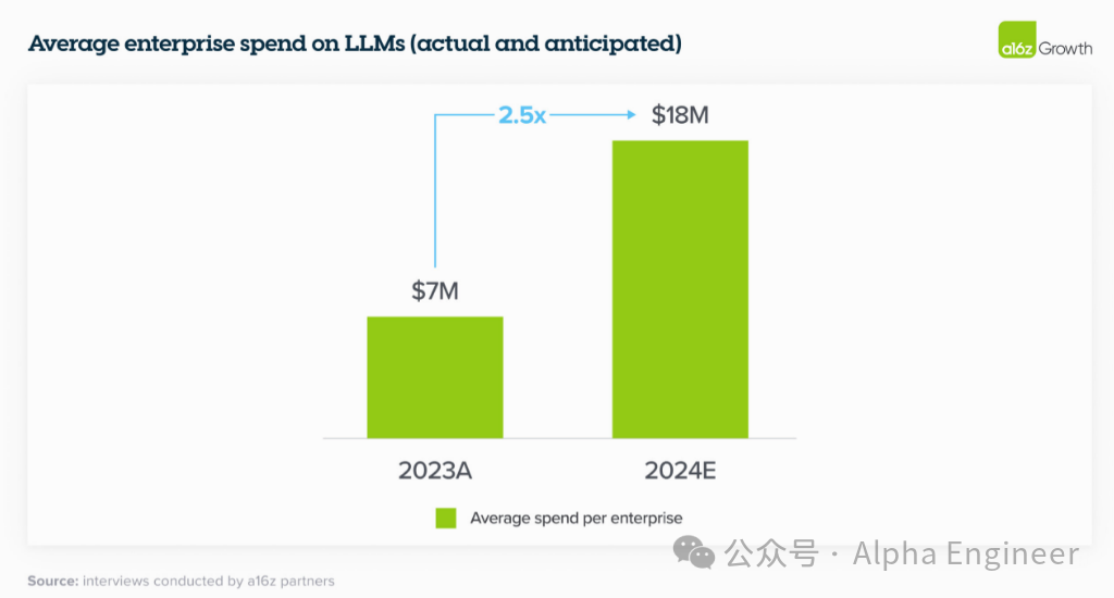 23年受访企业在大模型上的平均投入在700万美金,这个数字在24年提升至1800万美金,提升了2.5倍。
