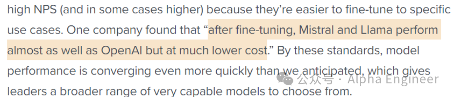 一家受访企业表示,经过微调后,Mistral和Llama的表现与OpenAI趋同,且成本更低。