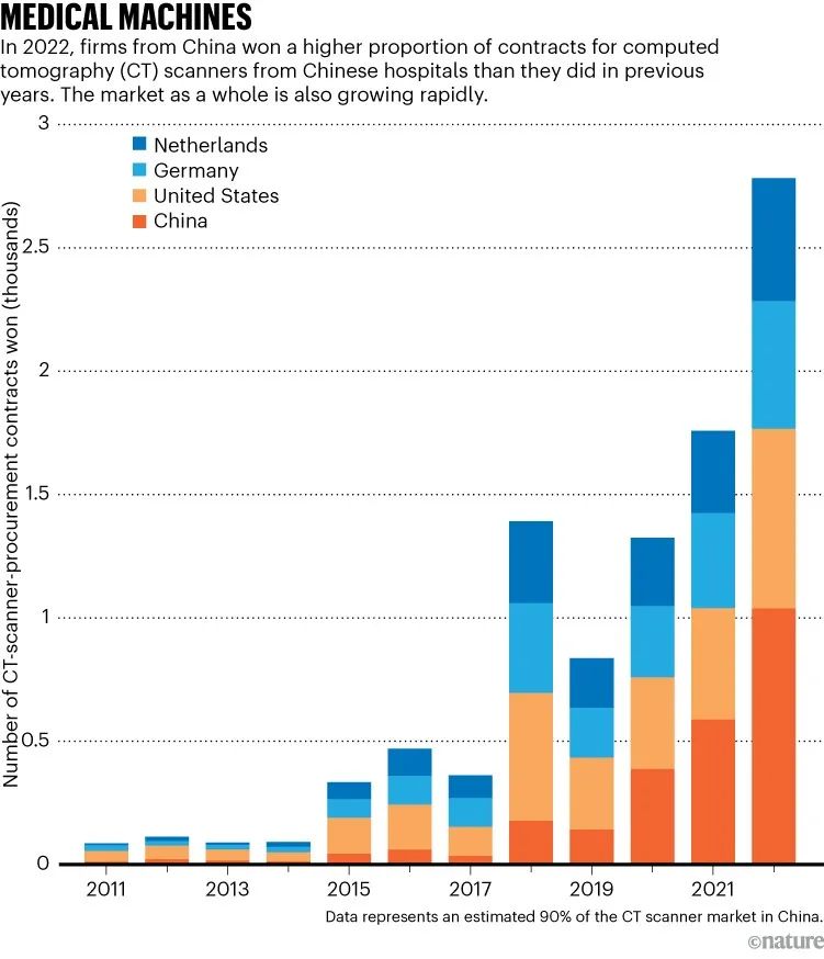 在20世纪90年代初,作为南京大学汉学专业的学生,Elisabeth Staudinger亲身体验了中国医疗保健的情况。作为研究的一部分,她敢于跋涉2000多公里前往中国西南边陲的云南。当时,该省部分地区非常偏远,需要医疗护理的人们往往只能等待周一到来,因为那是商人、医生和牙医们在每周市集上开张的日子。“现在来看,全国各地都有非常合理的医院和医疗保健基础设施,几乎实现了全民健康覆盖。” Staudinger说,她现在是德国埃尔兰根全球医疗技术公司西门子医疗的董事会成员。“情况远比以前好了。”她说,“但仍有许多工作需要做。”中国拥有约14亿人口,其中五分之一年龄在60岁以上。柏林智库墨卡托中国研究中心(MERICS)的科学、技术和创新分析师Jeroen Groenewegen-Lau表示,随着中产阶级的崛起以及与富裕相关的医疗状况的增加(例如2型糖尿病和高血压),中国已经开始着手预防性护理,而不仅仅是进行治疗。这意味着开放了昂贵的治疗和技术市场。MERICS分析师Alexander Brown意识到了成本问题,他表示,大约十年前,中国政府开始推动生产和使用更多本地制造的医疗设备,尤其是可以帮助早期疾病检测的X射线扫描仪等高端设备。2021年,这一举措进一步加大了力度,旨在削减成本并满足老龄化人口不断变化的医疗保健需求,同时促进创新并限制进口,以增强国家安全。这一战略正在影响中国的医疗器械行业和整个医疗技术领域。医疗技术包括使用信息技术来检测、收集和上传数据的设备。中国的医院已被要求尽可能采购中国制造的产品,国内外制造商也在改变业务运营和重点。2021年是有可查的最近一年,中国在医疗器械市场占据了20%的份额,仅次于美国。