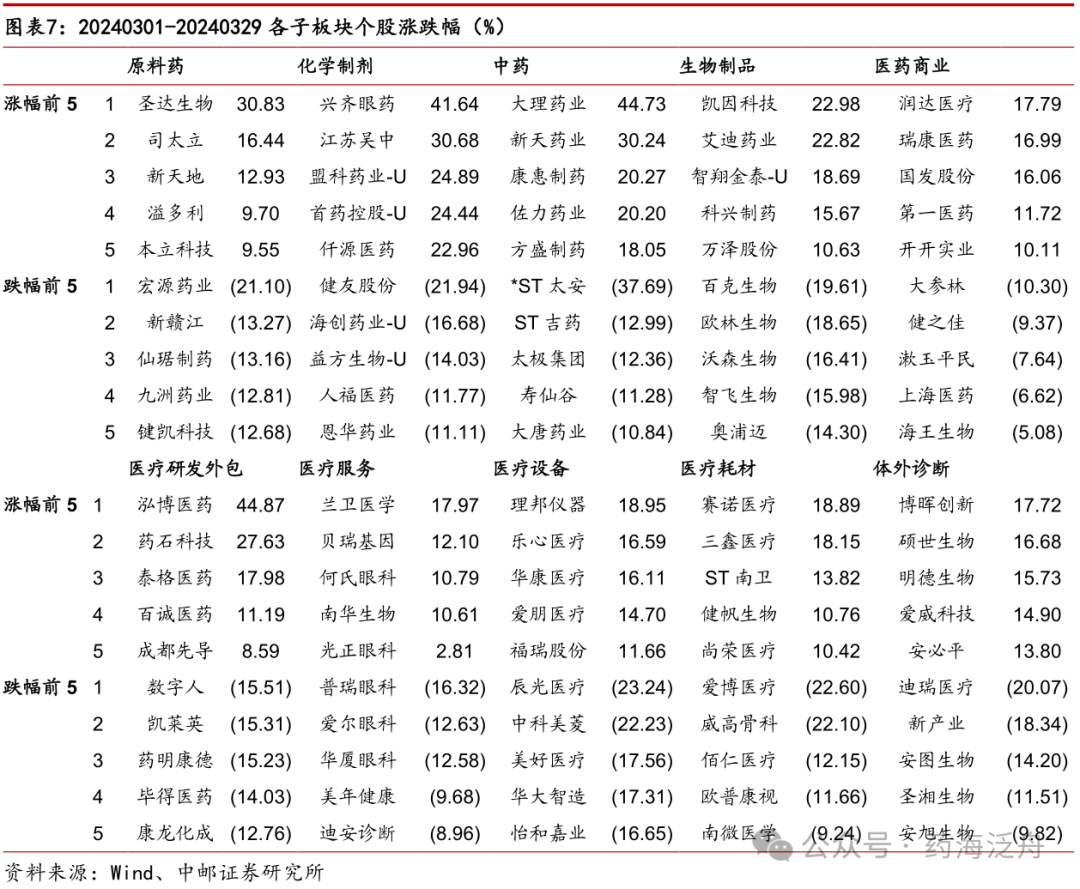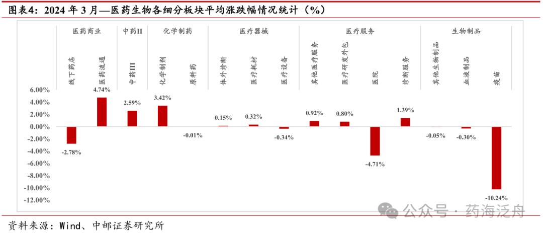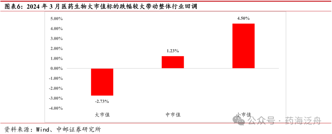 3月医药生物个股中,大市值标的跌幅较大带动整体行业回调,中小市值标的企稳上行。根据2024年3月29日的个股总市值数据,将总市值从高到低排序后划分1/3分位点(总市值约91.98亿元)及2/3分位点(总市值约37.62亿元),以此实现“大市值”、“中市值”及“小市值”医药标的分组。截至2024年3月29日,“大市值”标的平均跌幅约2.73%,回调显著,带动医药生物板块整体下行调整;“中市值”标的平均涨幅约1.23%,“小市值”标的平均涨幅约4.50%,3月中小盘医药股票表现稳健,行情持续向好。