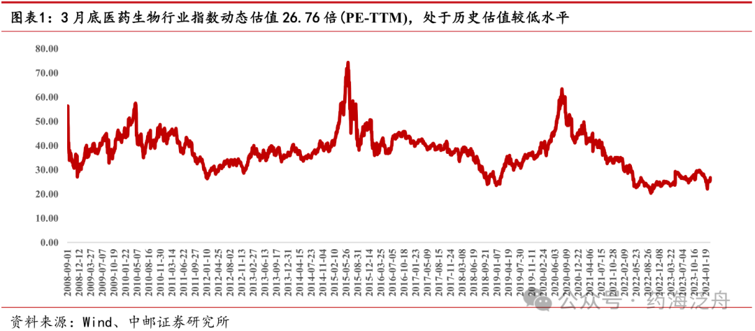 当前医药生物行业估值处于历史低位,3月医药生物板块回调。我们选取医药生物行业指数(801150.SI)作为样本进行分析,从近15年的整体趋势看,医药生物行业的历史平均估值水平PE(TTM)为37.39倍,最高值为74.37倍(2015年6月12日),最低值为20.31倍(2022年9月26日),截至2024年3月29日,生物医药板块PE(TTM)为26.76倍,处于历史低位。自2024年3月1日至2024年3月29日,A股稳中有升,上证指数上涨0.86%,深证指数上涨0.75%。分行业看,仅非银金融、房地产、煤炭、医药生物、建筑材料、美容护理、计算机和银行板块出现下跌回调,其余板块均出现不同程度上涨,其中有色金属板块涨幅超10%,石油石化、综合板块涨幅超5%。此外,医药生物自2月触底回升后有所下跌,3月跌幅约2.27%,位居各行业板块第28位。