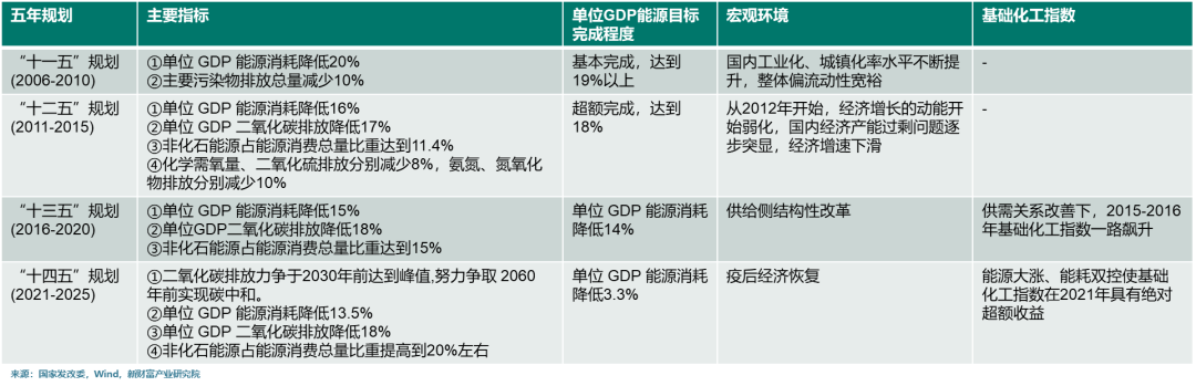 “能耗双控”制度最早脱胎于“十一五”时期国家提出的“节能减排”,在建设资源节约型、环境友好型社会的总体要求下, “十一五”规划中我国首次将“单位GDP能源消耗降低 20%左右”、“主要污染物排放总量减少10%”两项列为约束性指标。