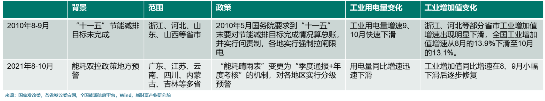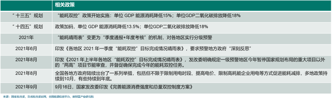 “能耗双控”制度最早脱胎于“十一五”时期国家提出的“节能减排”,2010年开始,国家发改委就开始根据各地节能目标的完成情况公布晴雨表,10年5月国务院要求到“十一五”末要对节能减排目标完成情况算总账,并实行问责制。10年8月国务院成立督查组,对浙江、河北等18个重点地区进行节能减排专项督查。为实现“十一五”节能减排目标,浙江、河北、山东、山西等省市开始拉闸限电。