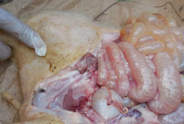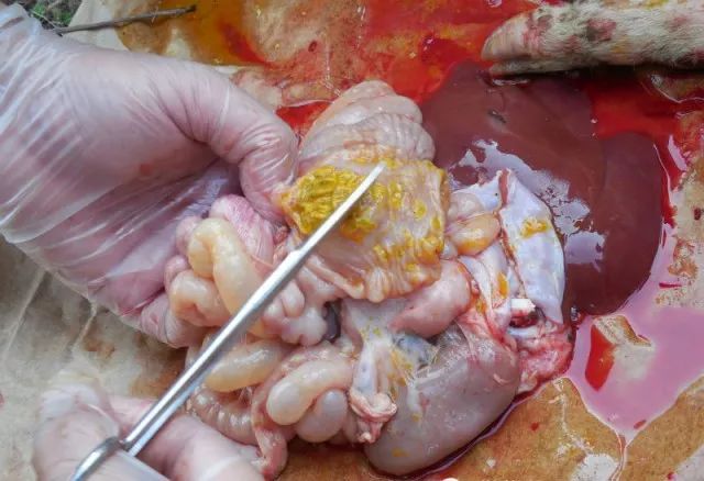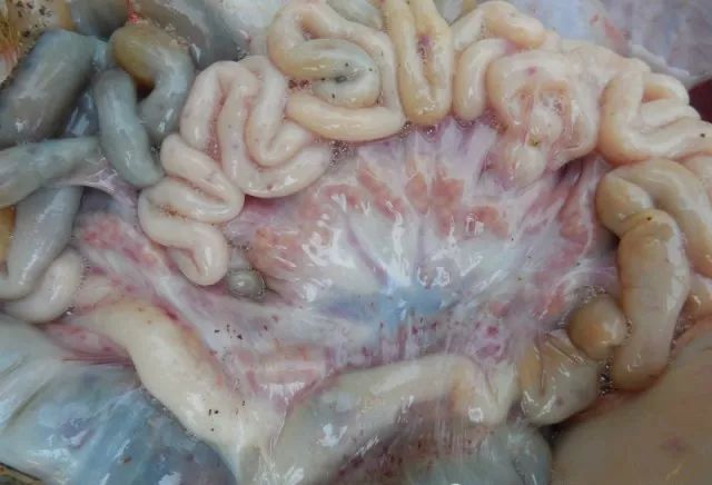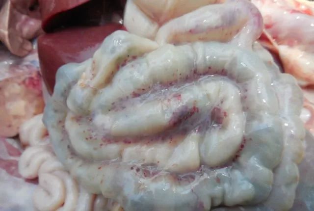 14、肠:外观内的粪便是液体还是固体,肠系膜淋巴结,乳糜管,回盲瓣有无溃疡(亚急性猪瘟),内粪便有无臭味,肠外膜、内膜有无出血,肠壁是否增生,内膜是否溃疡,是否有糠麸样病变(沙门氏菌感染即副伤寒)。