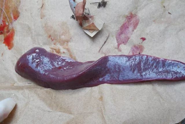 5、剥离胃肠摘下脾脏:a、脾脏的大小b、周围有无梗死(有梗死的可能为潜伏慢性猪瘟)c、有无出血点。