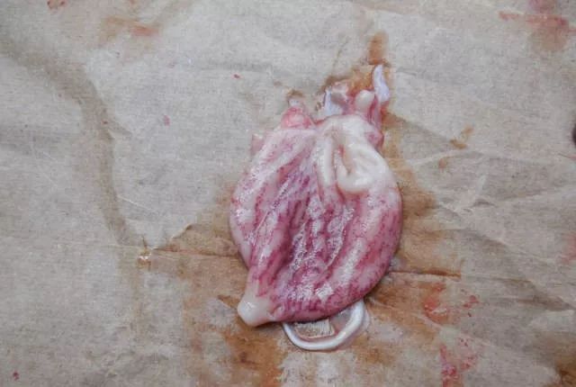 3、心脏:是否出现绒毛心(副猪嗜血杆菌),表面是否有出血点。打开心脏:观察心内膜、乳头肌、心肌有无白色条带(白肌病)、心肌的厚薄、心室心房的大小等。