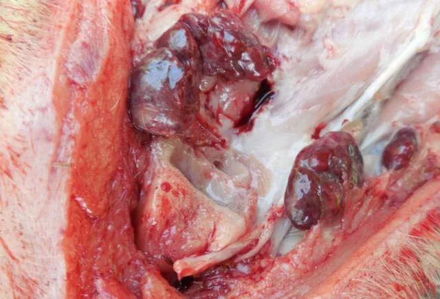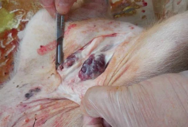 1、下颌淋巴结:一般猪有炎症该淋巴结都会有病变。