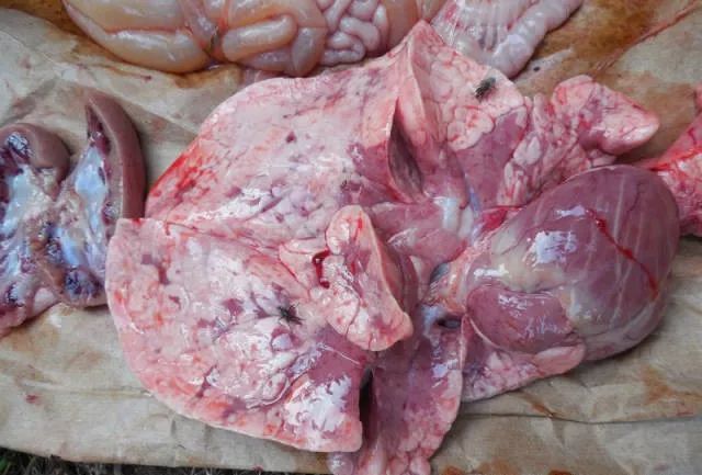 7、肺脏:肺脏的大小,是否水肿,是否肉变,有无伪膜(是否光滑)。