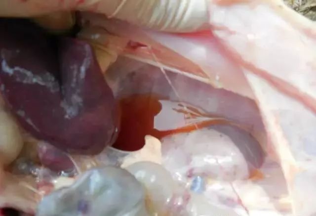 2、心包腔:靠近心尖剪一小口,观察心包液有无增多、变性;心包膜是否变厚等。