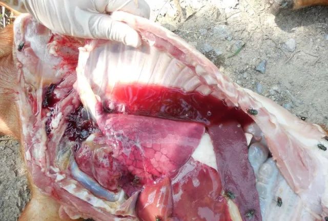 三、第三刀从后向前由肋软骨处切开,按压肋骨暴露胸腔,观察胸水(颜色,量的多少,有无渗出)