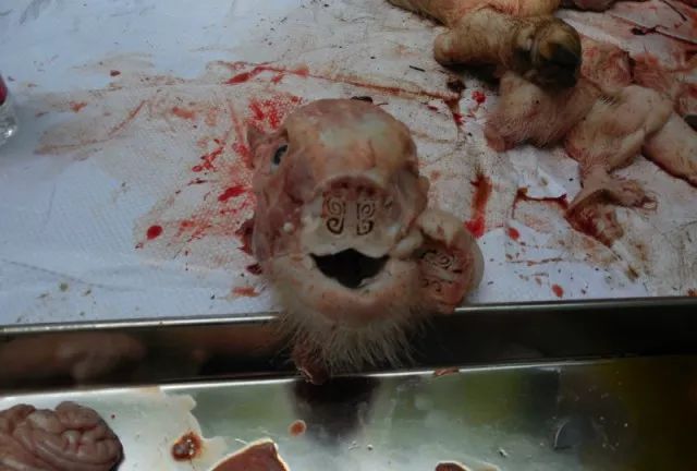 15、脑部:锯开颅骨暴露脑部,表面云雾状为细菌感染,无变化可能为病毒性疾病,脑室是否扩张。