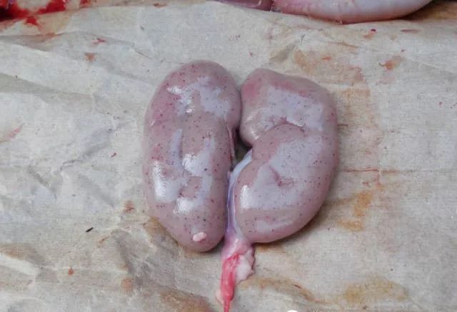 8、肾脏、肾上腺:肾脏表面是否存在针尖状的红点(布满出血点又叫麻雀蛋肾,可能为猪瘟),白色斑点(钩端螺旋体),肾盂是否化脓,肾小体是否出血。肾上腺在肾稍上方。