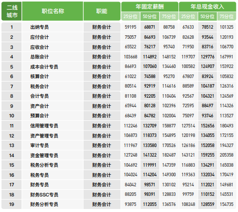 以资金管理专员、信用管理专员、审计专员在该类岗位中薪酬水平最高,出纳、应收会计、核算会计则成为薪酬排行尾部岗位。