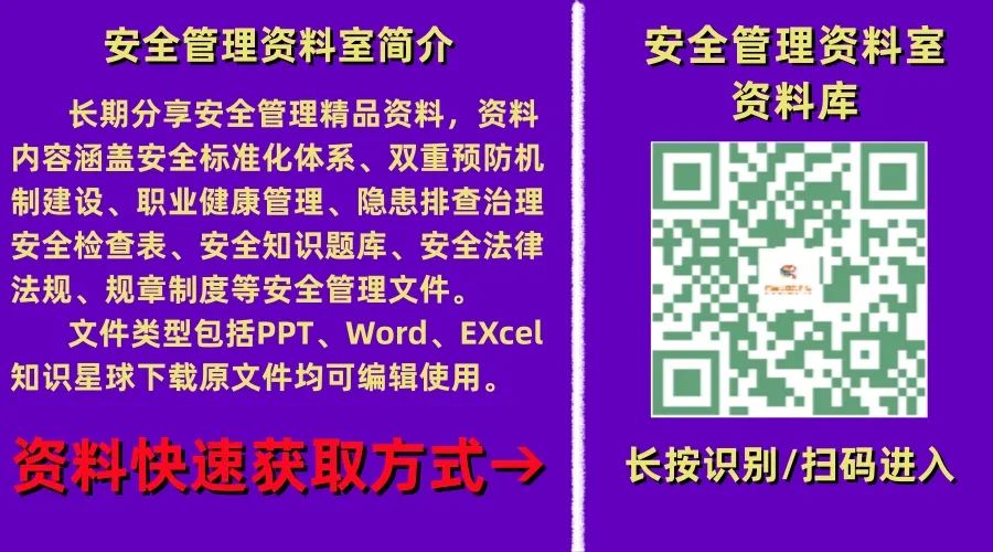 长按识别二维码加入平台知识星球(点击放大上图长按识别或扫描上边二维码),下载本平台发布的成套安全管理资料,包含上千份资料文件并持续更新中……