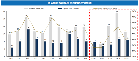 2013-2030年间,全球药品中共有1666个化合物专利到期,而根据EvaluatePharma统计,2020-2024年间,具有到期风险的专利药呈现急剧增加的趋势,合计市场规模达1590亿美元。