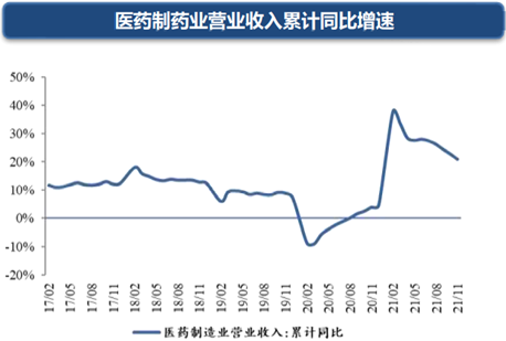 国家统计局规模以上医药制造业数据:截至到2021年11月,累计实现营业收入26,094.6亿元,较去年同期相比增长18.6%,2019-2021年复合增长率为9.92%,实现利润总额5,403.5亿元,较去年同期相比增长71.8%,2019-2021年复合增长率为37.9%,表明医药制造业已从疫情影响中走出,实现高增长。