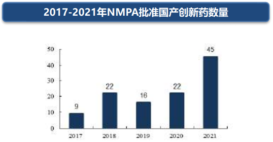 截止2021年12月31日,NMPA批准45款国产创新药上市,包括化药16款,生物制品19款,中药10款。国产新药上市数量创历年之最,相比2020年增长1倍多。