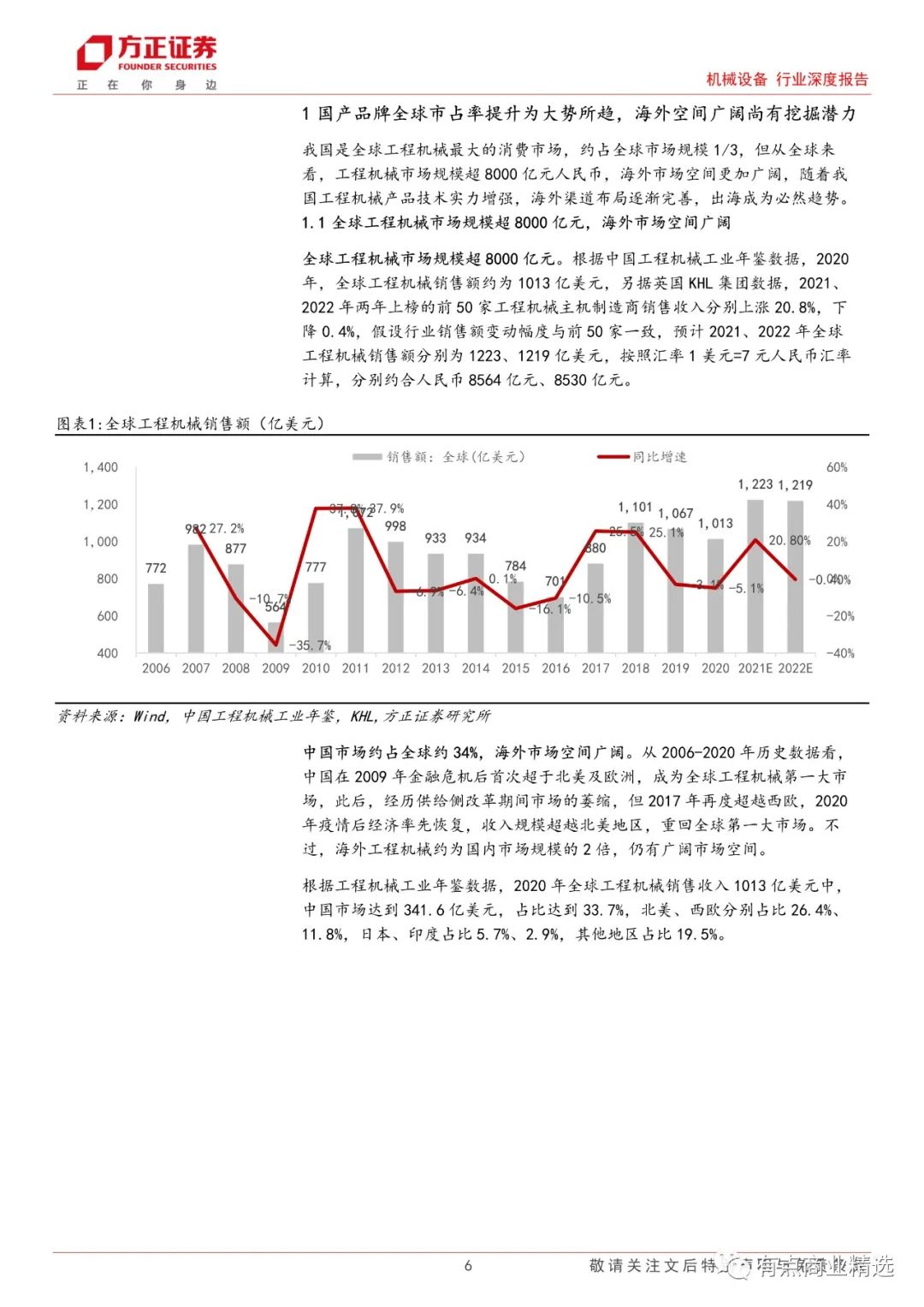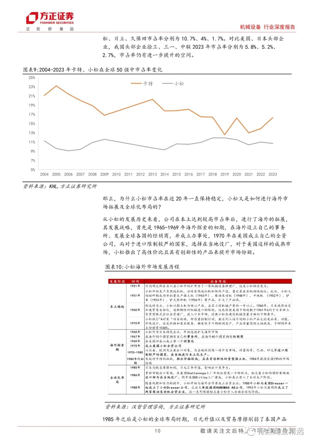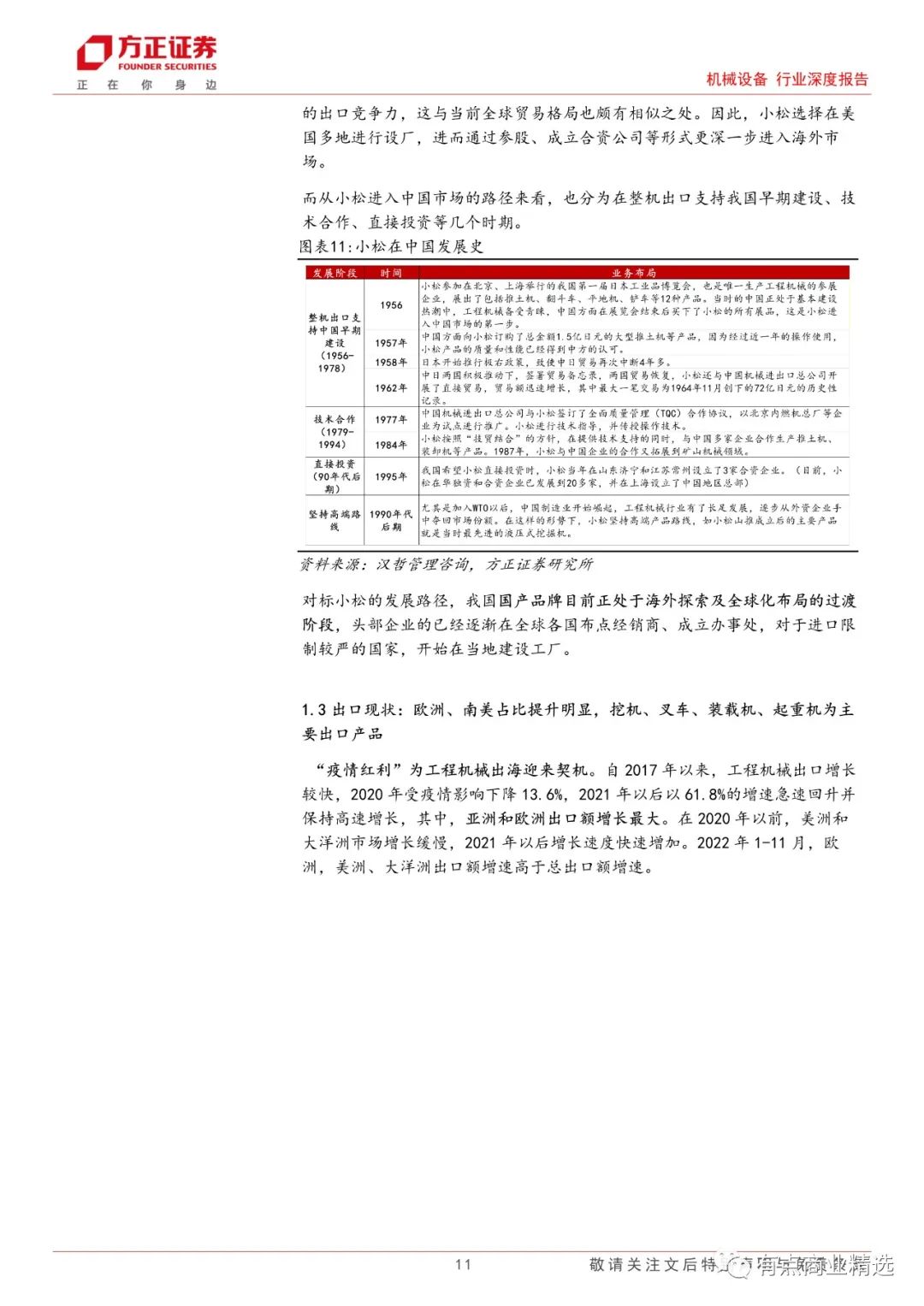 我国是全球工程机械最大的消费市场,约占全球市场规模 1/3,但从全球来看,我们测算工程机械市场规模约为 8530 亿元人民币,海外市场空间更加广阔。对标小松的发展路径,我国国产品牌目前正处于海外探索及全球化布局的过度阶段。