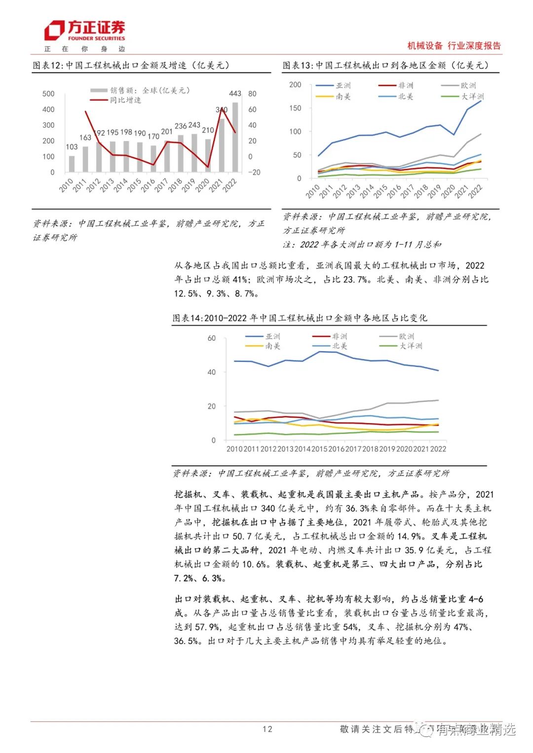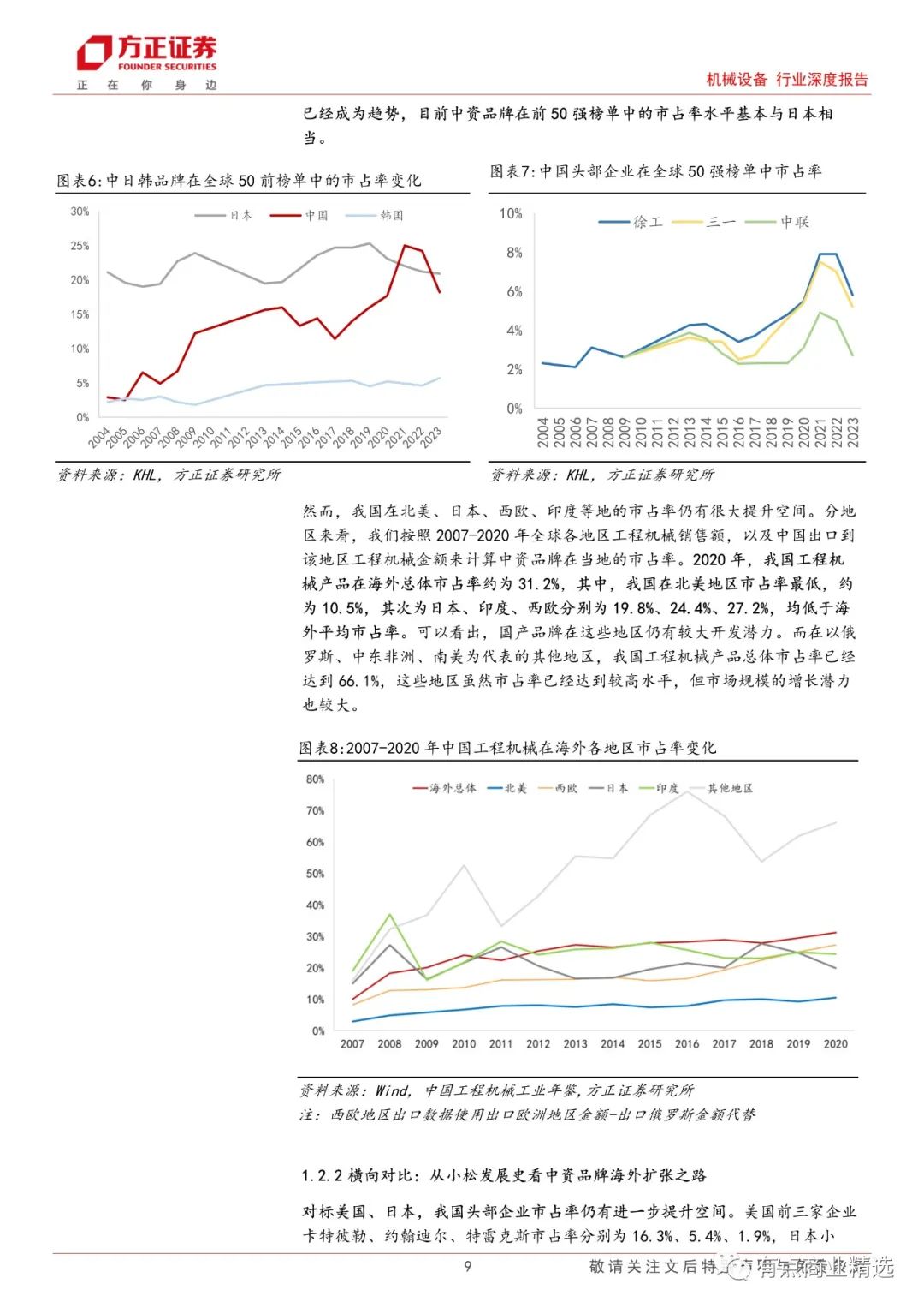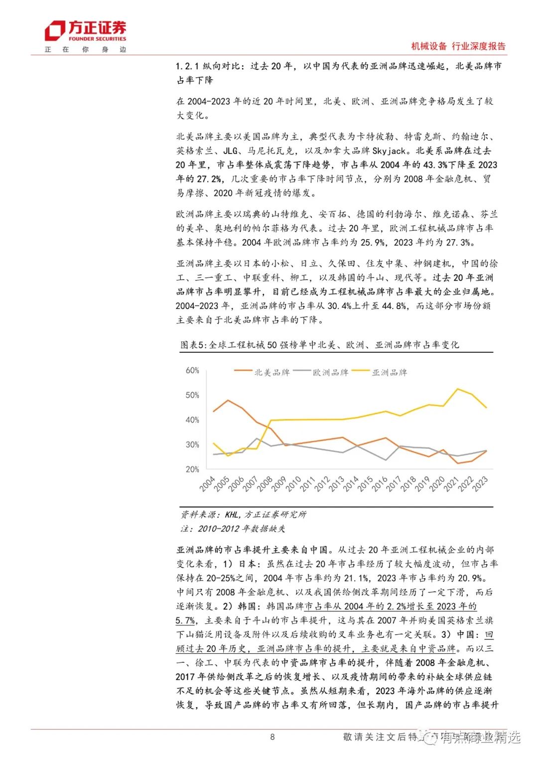 根据 KHL 每年发布的全球工程机械 50 强榜单,过去 20 年里,欧洲品牌市占率基本保持稳定,而亚洲品牌市占率从 2004 年的 30.4%上升至2023 年的 44.8%,与此相对应的北美品牌市占率从 43.3%下降至 27.2%,而增长的亚洲品牌中,中资品牌贡献了主要力量。