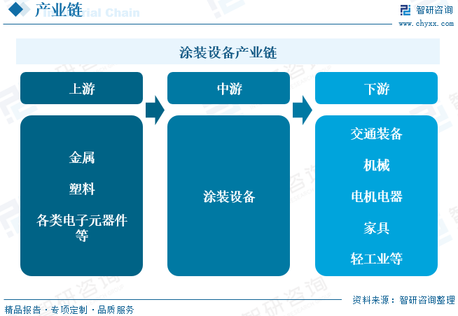 从产业链来看,涂装设备上游是金属、塑料、电子元器件等。涂装设备下游应用十分广泛,主要应用于交通装备、机械、电机电器、家居、轻工产品等领域。