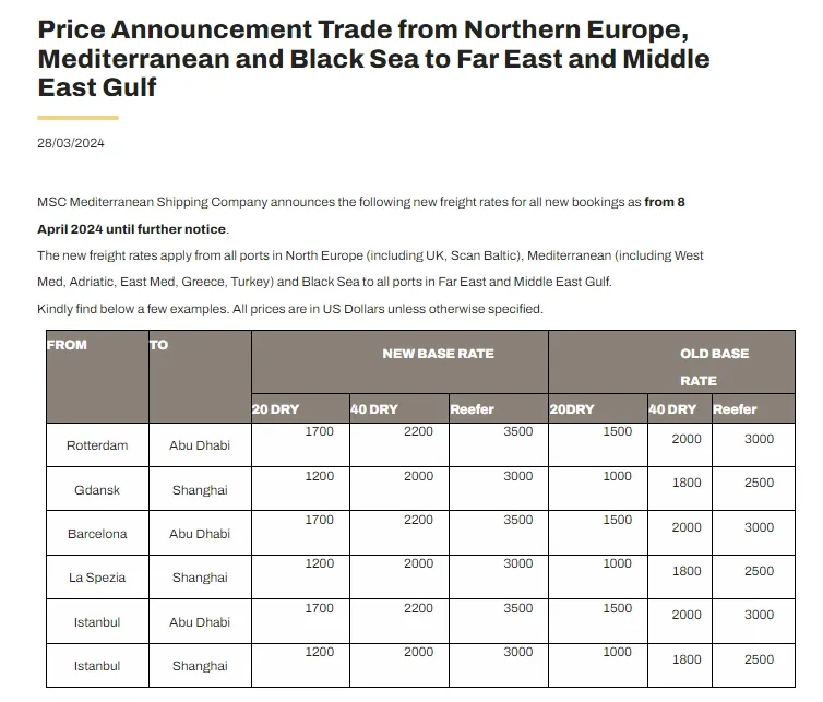 此前,3月18日赫伯罗特曾发布公告,宣布自2024年4月1日起,对亚洲(不包括日本)至拉丁美洲航线运费调涨:小柜涨700美元,大柜涨900美元。4月1日上涨900美元/柜,仅时隔一周,4月8日将再次推涨1000美元/柜,也就是说,两次累计涨幅最高达1900美元/柜。除了赫伯罗特接连涨价,万海航运也在半个月内对同一航线连发两则涨价通知。3月29日,万海发出公告,宣布“因公司各项运营成本不断攀升,现针对全中国区出口至亚洲区(近洋航段)的货载实施运价调涨。”自第15周起(即4月8日),小柜再涨50美元,大柜涨100美元。详情如下:3月15日万海航运曾发布通知,宣布自第13周起对全中国区出口至亚洲区(近洋航段)的货物小柜上涨50美元,大柜上涨100美元。3月28日,MSC官网发布了从北欧、地中海、黑海至远东、中东海湾的最新价格公告。公告称,从北欧(包括英国和波罗的海沿岸),地中海地区(包括西地中海,亚得里亚海,东地中海,希腊和土耳其),以及黑海所有港口到远东和中东海湾所有新预订的最新运费,4月8日起生效,直至另行通知。详情如下:3月29日,HMM官网发布通知称,将从2024年5月1日起对所有始发地驶往美国、加拿大和墨西哥的服务实施新的GRI。详情如下: