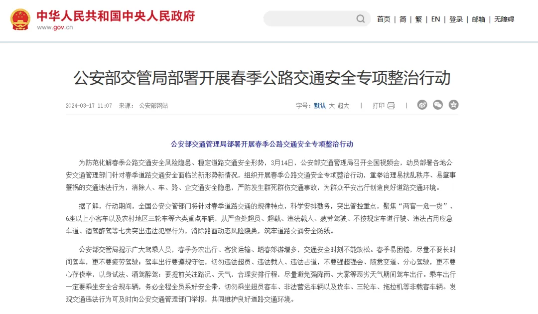 为了加强春季公路交通安全管理,公安部交通管理局近日召开了全国视频会,部署开展春季公路交通安全专项整治行动。该行动将针对春季道路交通的特点,突出管控重点,聚焦“两客一危一货”、6座以上小客车以及农村地区三轮车等六类重点车辆。同时,将严格查处超员、超载、违法载人、疲劳驾驶、不按规定车道行驶、违法占用应急车道、酒驾醉驾等七类突出违法犯罪行为。