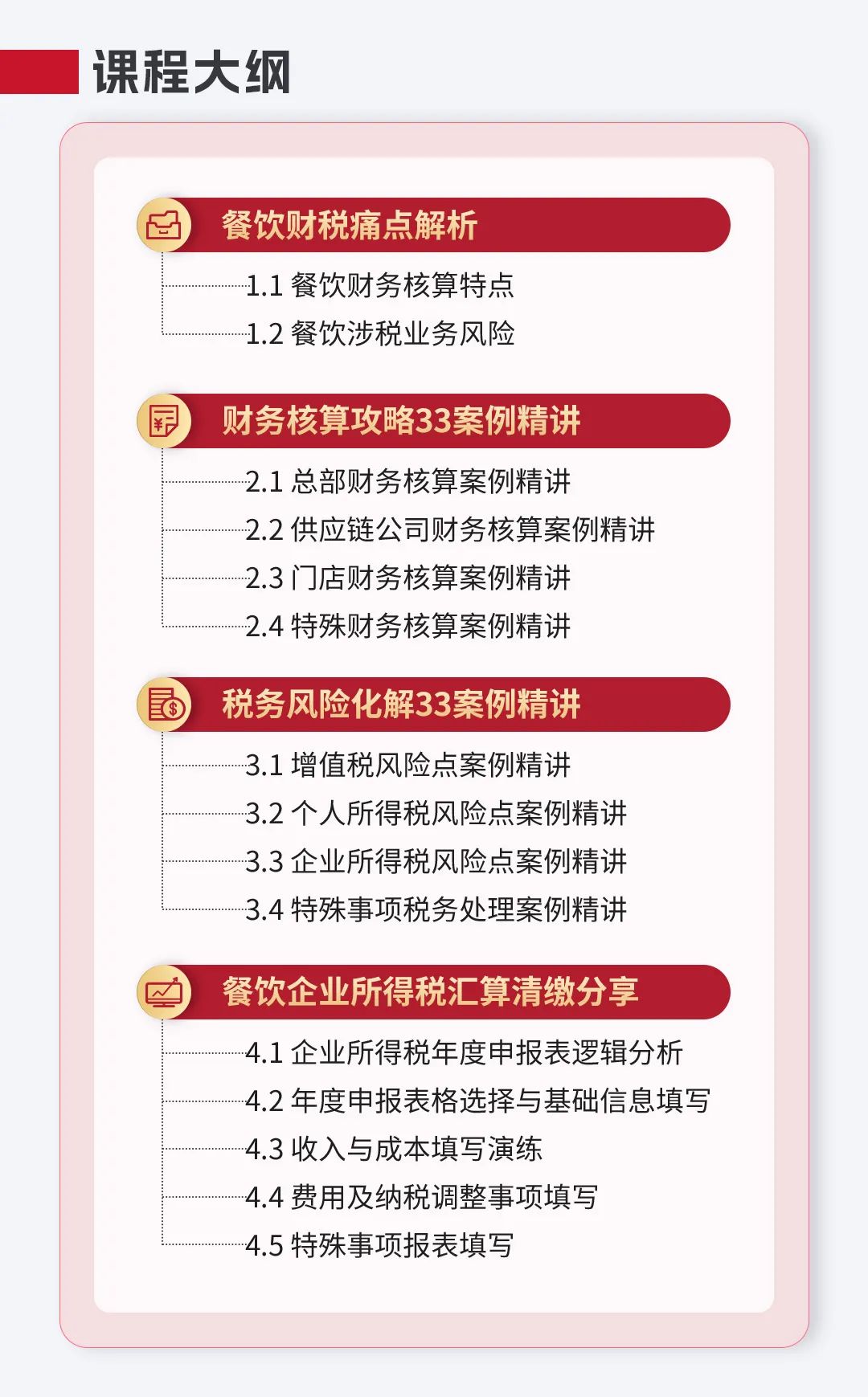 本课程深入剖析餐饮企业的财务核算特点与涉税风险,让你一次性掌握财税核心,避免走弯路!从总部到门店,从供应链到特殊业务,66个实战案例,让你轻松掌握餐饮企业的财务核算要点。