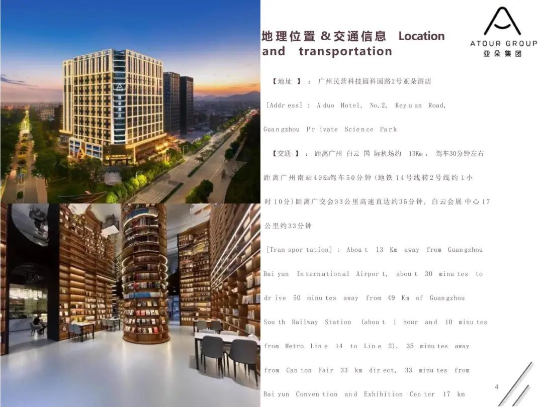 广州白云太和民营科技园亚朵酒店位于广州白云科园路2号广州民营科技园凯铂中心1楼。距离广州白云国际机场约 13Km 驾车30分钟左右距离广州南站49Km驾车50分钟(地铁14号线转2号线约1小时10分),距离广交会33公里高速直达约35分钟白云会展中心17公里约33分钟,近金铂天地购物中心,太和地铁站。酒店设计理念以阅读与属地摄影为主题,为您营造舒适,简约,朴实,静谧的住宿体验,酒店的超大阅读会友书吧-竹居, 7*24 小时的阅读空间,将给您带来一片心灵的栖息地,酒店客房全智能控制系统。床上用品均采用高端床上用品,高端国际品牌洗浴用品,提供150M高速无线网络,为您提供高品质,舒适,超值的住宿体验;酒店每日早餐均为为您提供广东特色早茶蒸点与小吃。酒店还设有餐厅(相招) 、多功能会议室(共语) 、健身房(汗出) 、及24小时自助洗烫烘干自助洗衣房(出尘),为您提供一个自在,放松的居停空间