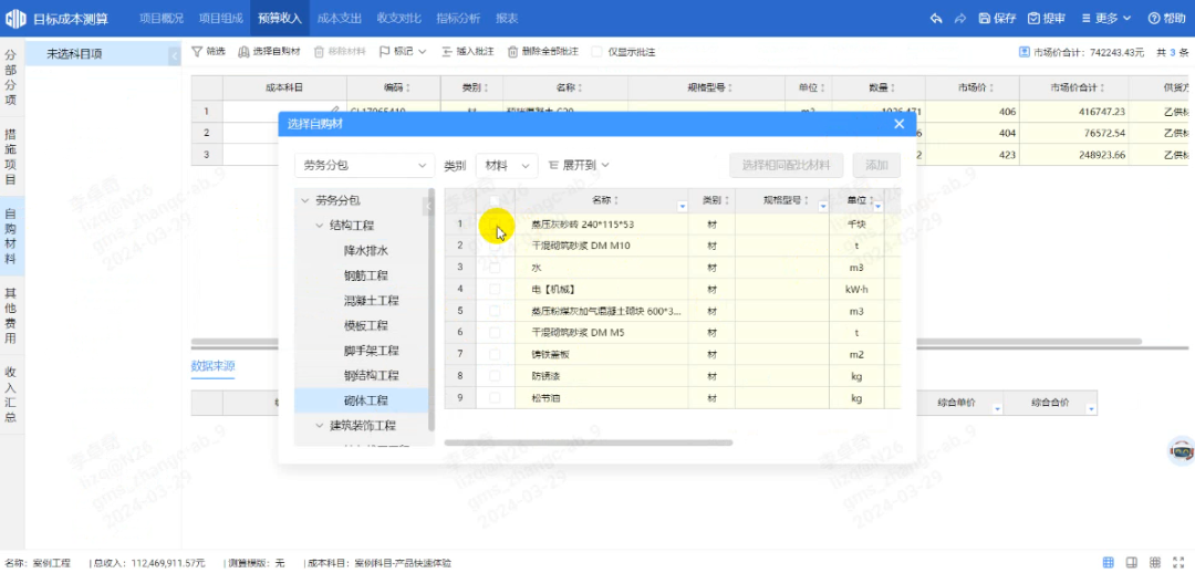 广联达成本测算产品,开始测算时导入计价文件,可以按照专业、楼栋等维度手动选择范围,进行相同清单的合并。与此同时,当计价文件需要更新时(如业主通知清单勘误、投标计价定额换套、材价更新等),软件可以根据计价文件变化,一键刷新,减少了清单检查的困扰,也避免了在Excel里调整清单内容、工程量逐条调整的困扰。