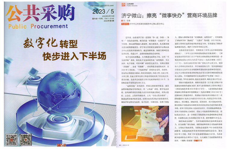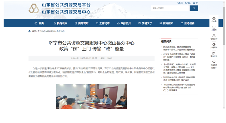 发布渠道再拓宽,让公开更立体。将中心网站作为招标投标信息公开主阵地,第一时间将招标投标信息传达至各方交易主体,提高信息获取的便捷度和传播率。同时,及时将我县在重点任务落实、打造先进典型案例等情况以及贯彻落实省、市、县关于优化营商环境工作部署中的好经验、好做法宣传出去,构建立体宣传格局。2023年全年,共对外发布宣传信息80篇,其中省公共资源交易中心17篇、济宁市公共资源交易中心23篇、鲁网2篇、搜狐网13篇、公共采购16篇(其中2篇被公共采购杂志刊发)、齐鲁云采8篇(其中4篇入选齐鲁云采周刊)、云采科技1篇,有效提高了招标投标营商环境美誉度,招标投标营商环境更显微山特色。