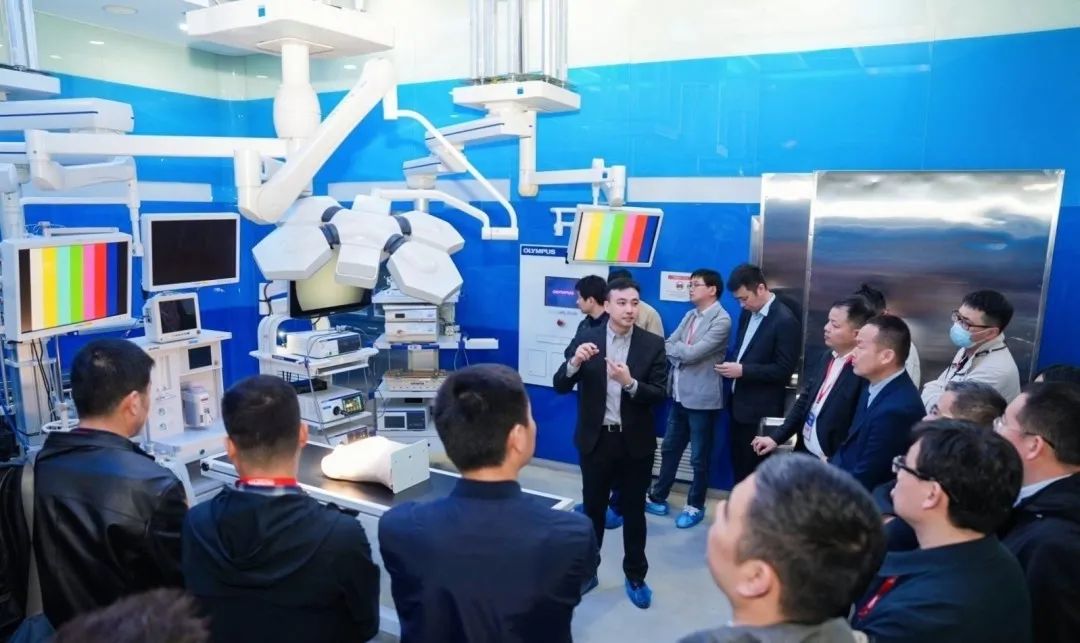 学术论坛环节结束之后,会议嘉宾一同参观了双镜微创中心。工作人员通过专业的讲解和示范,向与会人员详细介绍手术中心的功能,并模拟了临床应用的实操场景。在了解产品及手术室方案的同时,与会人员也就胃肠外科的建设、科室的高质量发展等热点问题进行了充分的交流,分享了各自的想法与经验。