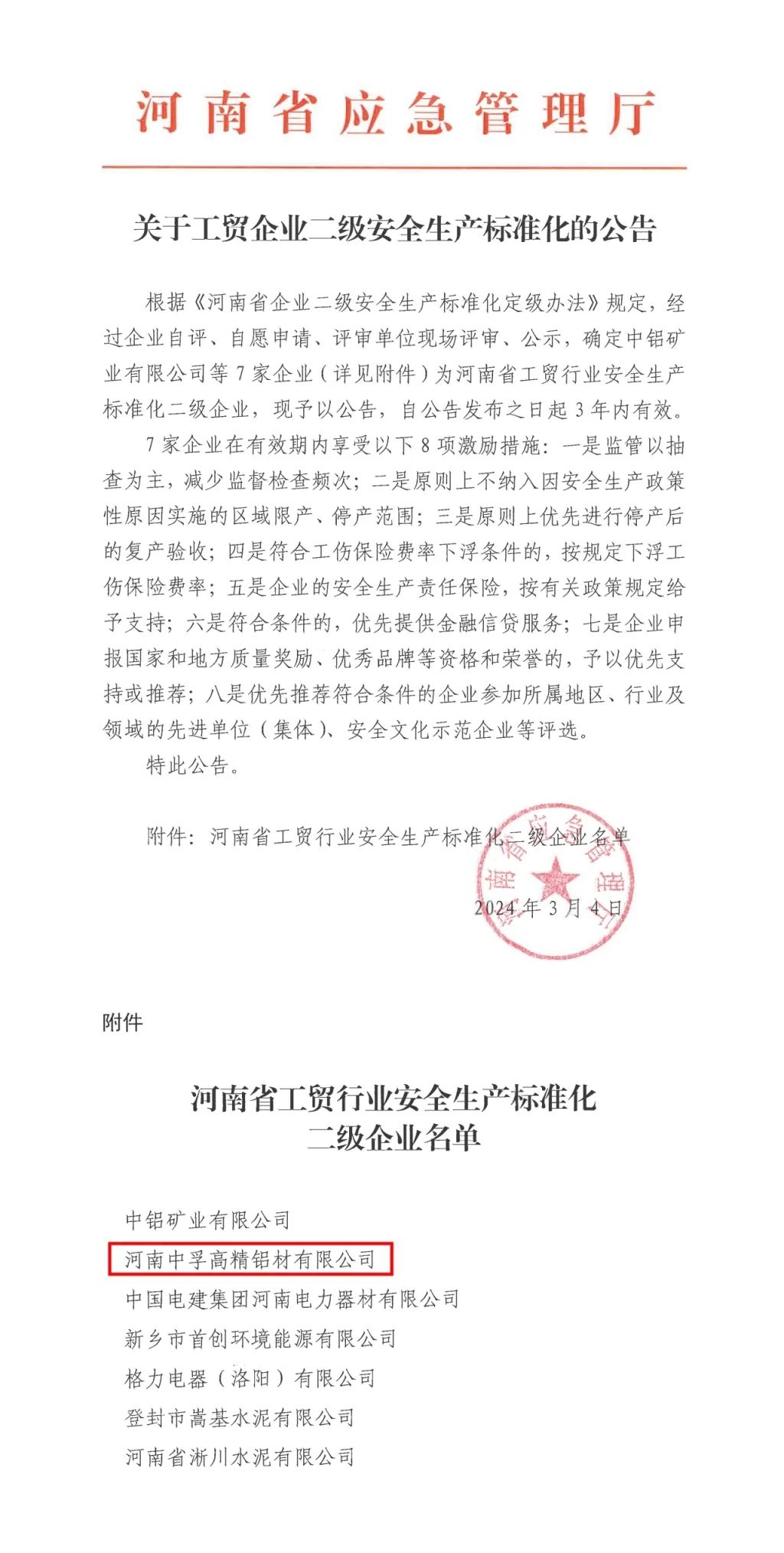 近期,由河南省有色金属协会和河南省应急管理厅组织的有色金属行业安全生产标准化培训暨观摩会在三门峡市灵宝市召开。省厅领导在会上宣布了本批次二级标准化评选通过企业,中孚高精铝材公司获批河南省工贸行业安全生产标准化二级企业。
