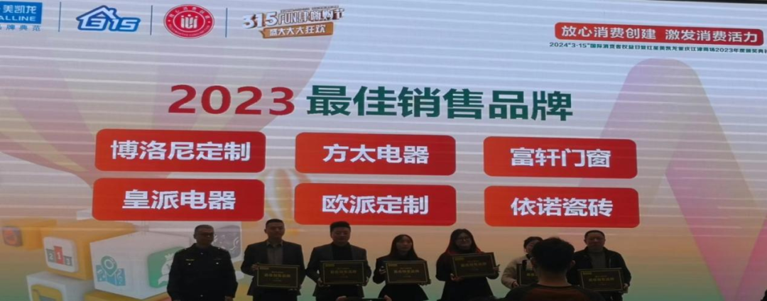 江津区装饰建材商会荣获2023重庆市放心消费创建示范单位,会员企业方太电器、欧派定制、依诺瓷砖荣获最佳销售品牌,副会长慕春平、理事蔡丙河、会员唐华丽荣获2023最佳年度经销商,副会长陈才华及经营门店荣获2023零投诉、省级优秀店长、优秀导购荣誉。