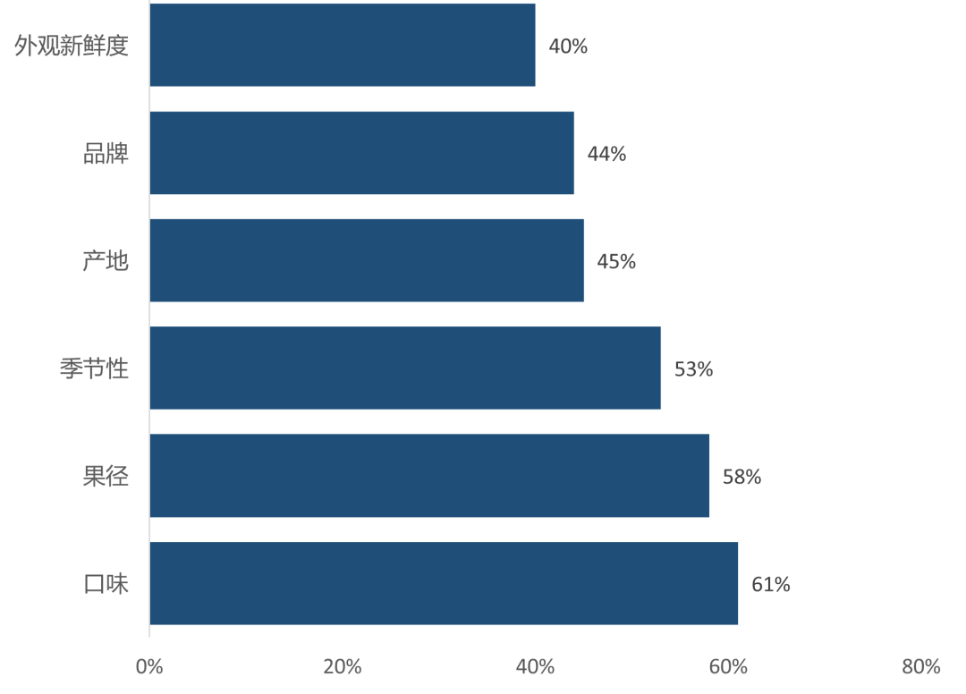 口味、果径大小和外观新鲜度是消费者购买蓝莓时考虑的和果品自身品质相关的重要因素。