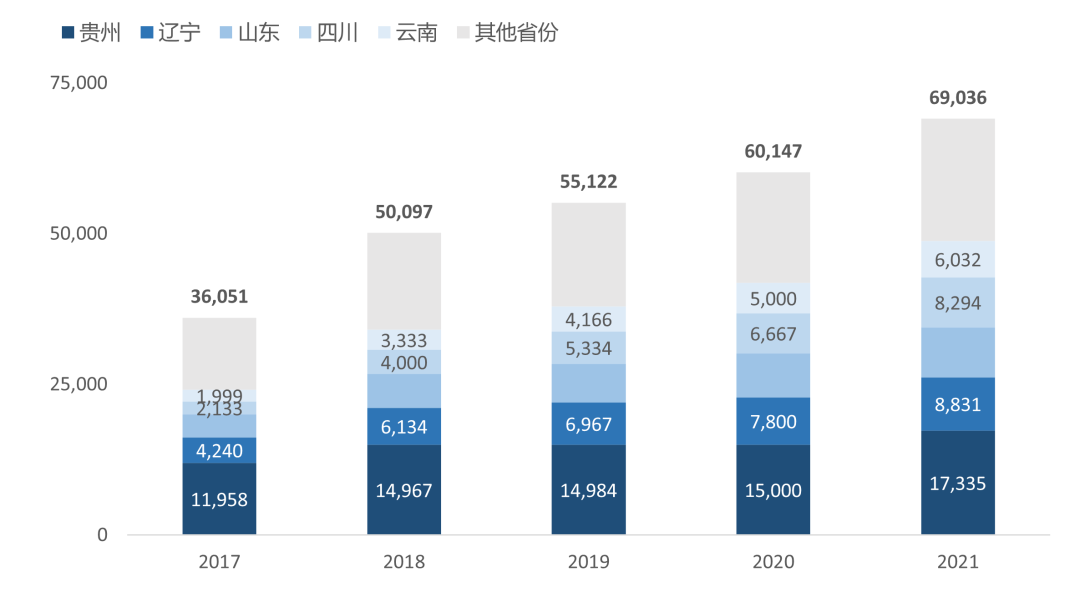 就我国蓝莓种植省份来看,贵州、辽宁、山东、云南和四川位居前列。其中种植面积位列第一的是贵州,四川、云南、辽宁居增量前三。