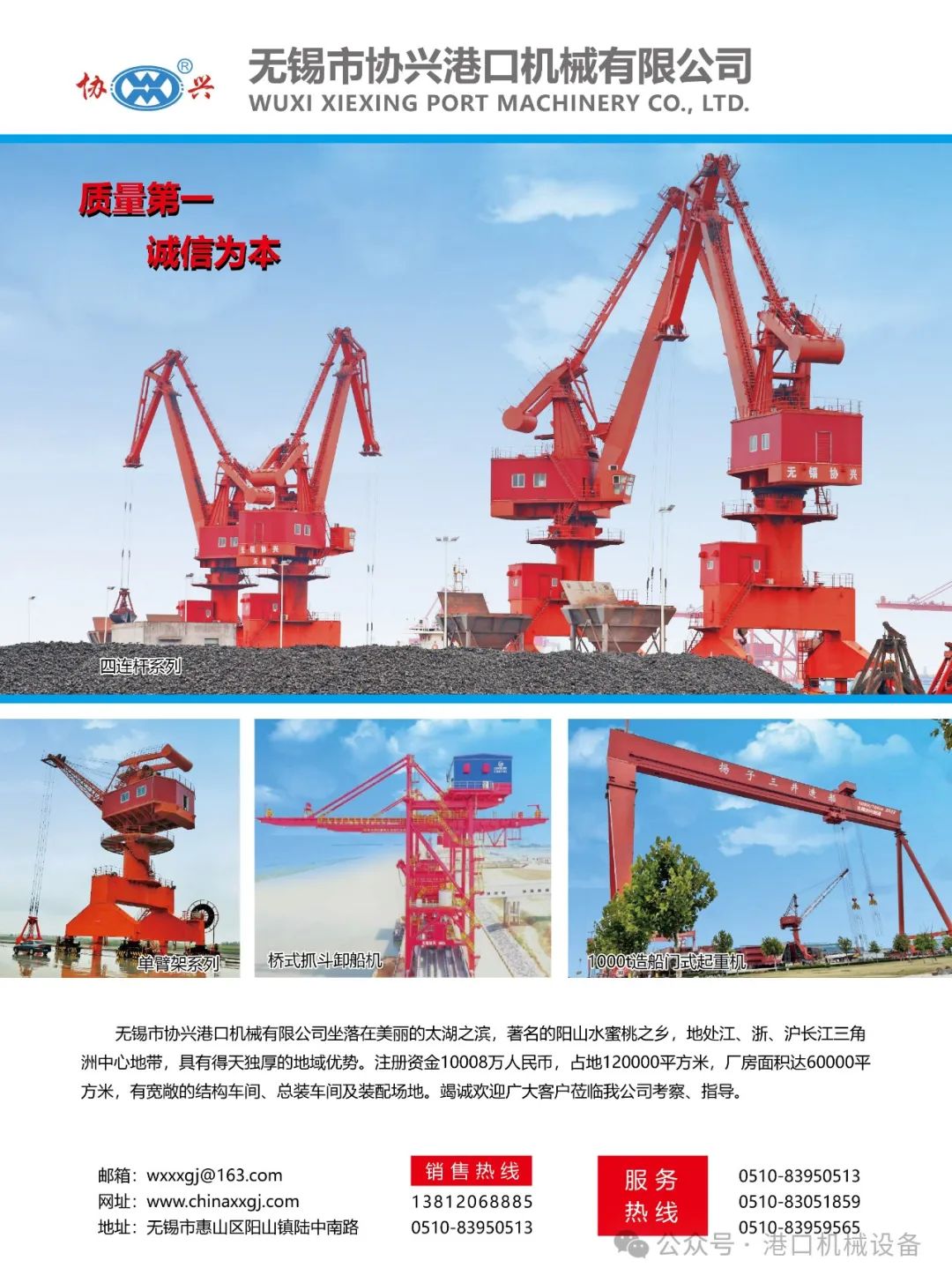 协兴公司是港口起重机械的专业制造和开发企业,注册资金 10008 万人民币,占地 120000 平方米,生产厂房面积达到60000平方米。除了大面积厂房,公司更注重引进硬件设备,生产线上拥有齐全的冲压、铆焊、金切等制造成套设备,大大提高了生产自动化的程度,并拥有完整的理化、UT 及 X 射击探伤等检验设备。强大的设备投入是产品质量的关键保障,有设备还要有科学规范的管理,多年的努力,公司通过了 ISO90015 质量管理体系、ISO14001 环境管理体系、ISO45001 职业健康安全管理体系认证,大大提升了公司由粗放生产企业向精细化管理企业转化的速度。我们始终坚持人尽其才、每个人都是人才的管理理念,特种设备的生产制造的每一个环节都不能有疏忽,公司倡导全过程质量管理,让每个岗位都是关键工序、使每个控制岗位的人都是人才,正是如此,我们从生产安装工人到设计开发工程师,让大家在知识、技能、意识上不断提升,与时俱进的紧跟时代发展要求,打造出一大批有能力有素养的协兴员工,从而让公司具有了一流的技术水平和生产能力。公司现拥有一大批高、中级职称的管理、技术人员和技艺精湛的工人,具备设计、制造、安装及新产品开发等能力。我们还可以根据客户的需求设计、制造个性化定制产品。在全体协兴人的拼搏下,我们先后开发出门式起重机、门座式起重机、桥式起重机、轮胎起重机、固定式起重机、卸船机等产品类别。产品主要分布于国内外海港、内河各港口及工矿企业,产品销往全国二十多个省、市、自治区,并出口至东南亚国家,得到了广大用户的一致好评。