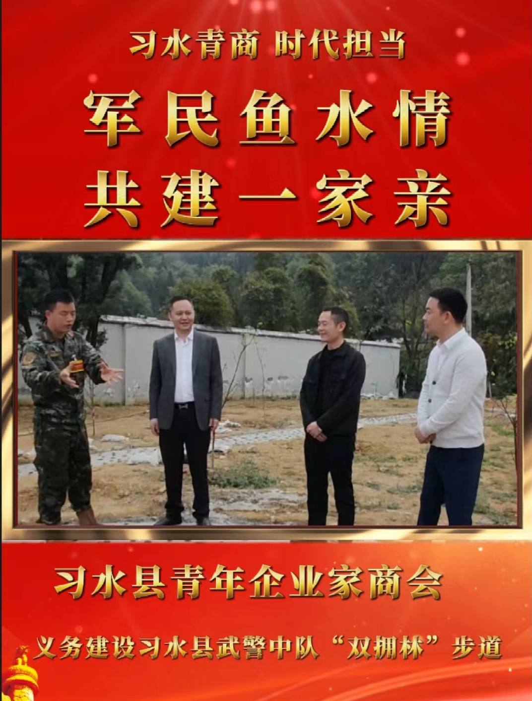 习水县青年企业家商会为巩固和发展爱国主义情怀,激发拥军爱国的精神力量,在县政协、县工商联、县双拥办的指导下,积极响应习水县“双拥”工作号召,自愿义务建设习水县武警中队“双拥林”步道。