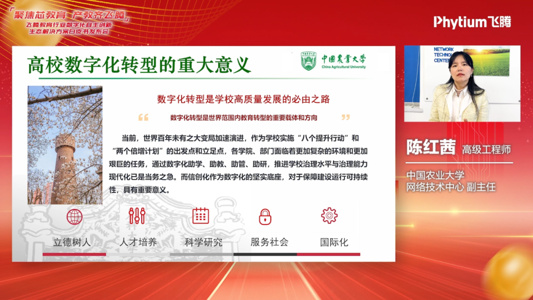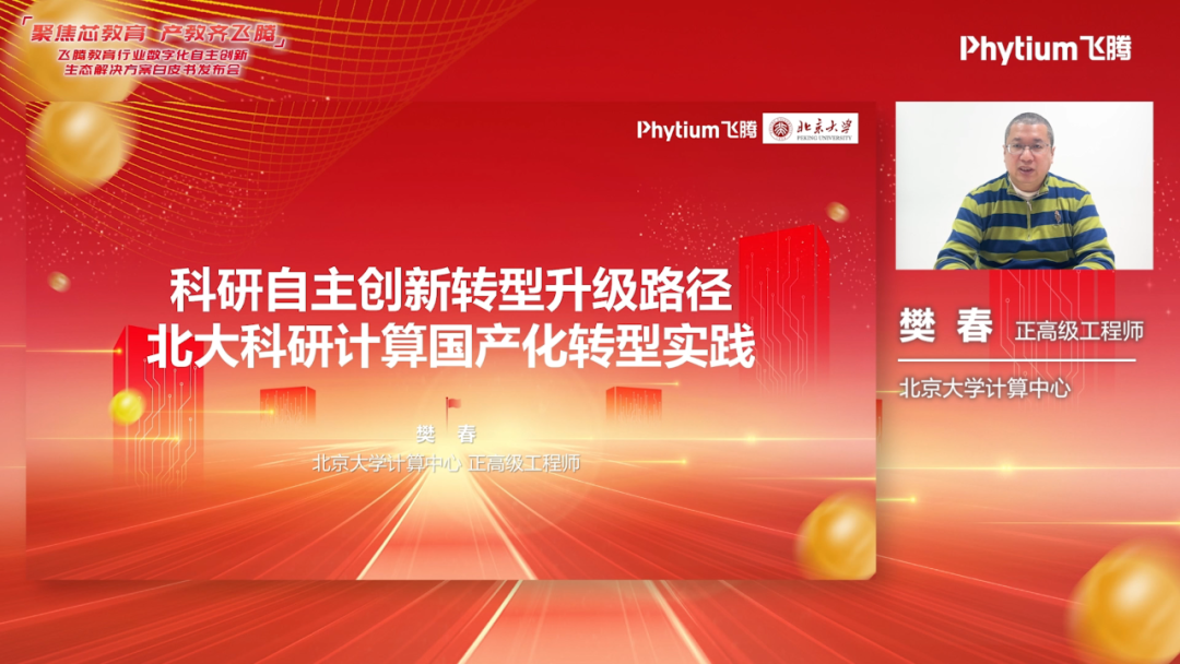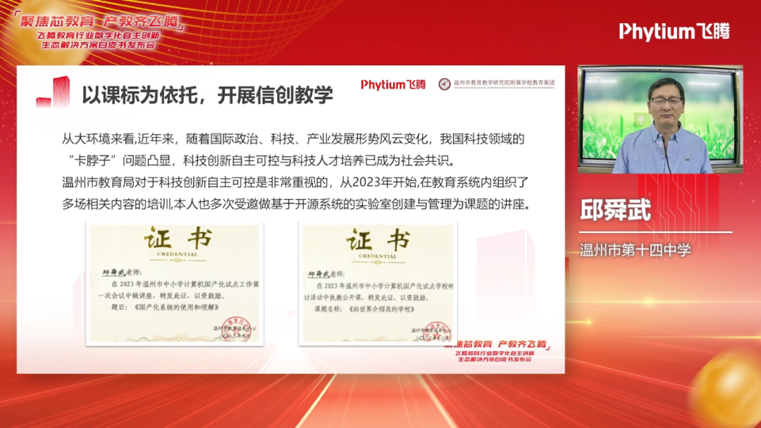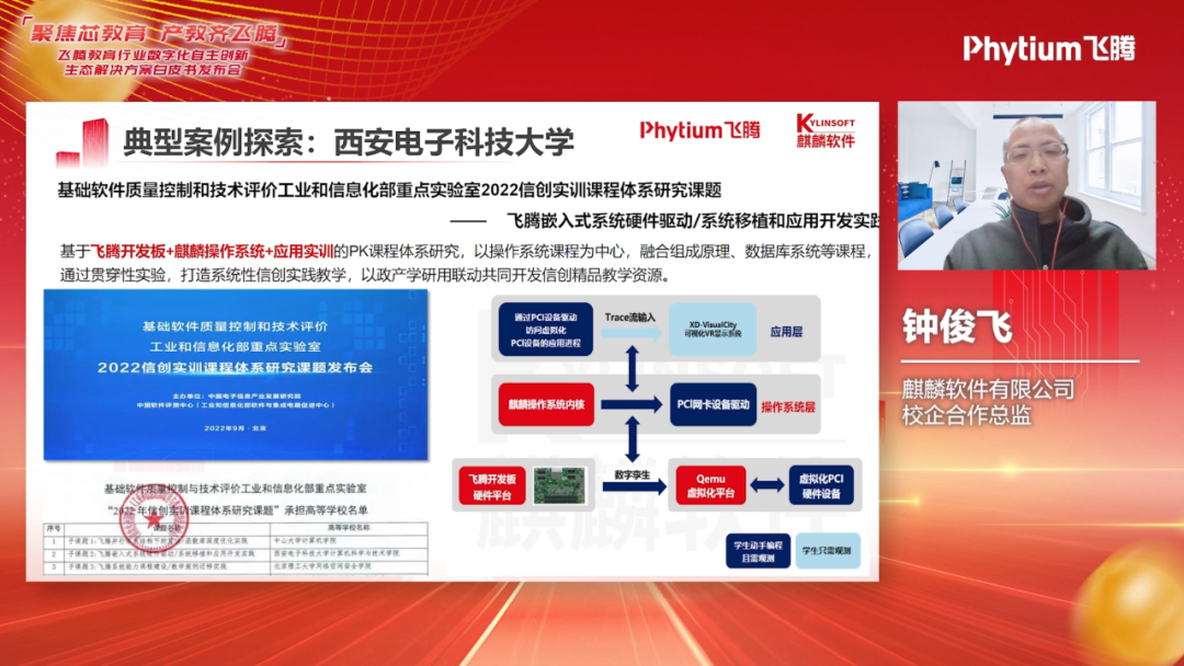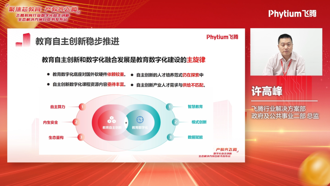 飞腾公司教育行业解决方案总监许高峰 简要介绍了白皮书发起的初衷,对白皮书的内容分布、典型案例进行了详细解读,并进一步阐释了飞腾公司立足科技企业视角对教育信创的认识。