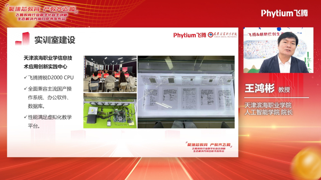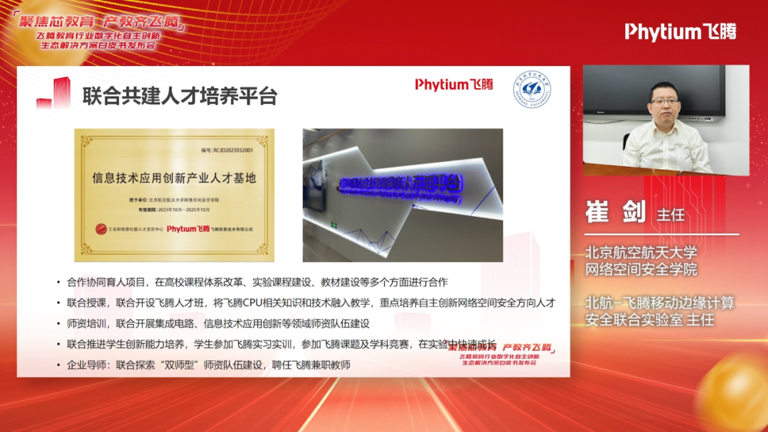 来自北京大学、北京航空航天大学、中国农业大学、天津滨海职院、温州十四中学、麒麟软件的专家们分别从科研创新、人才培养、校园管理、思政教育等角度分享了基于飞腾 CPU 的实践案例,畅享与飞腾纵深合作的光明前景。