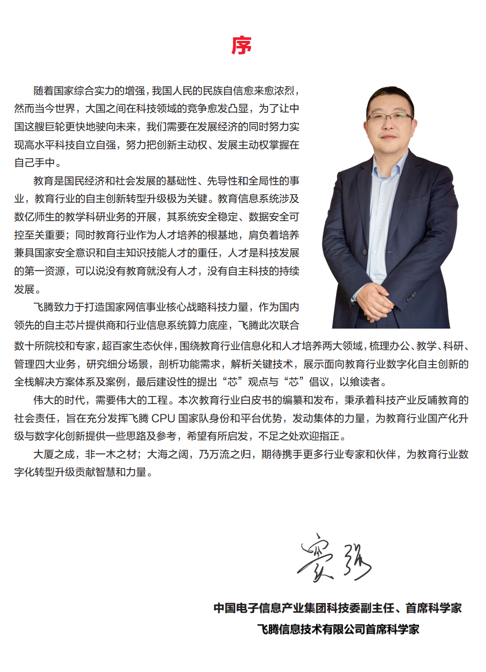《教育白皮书》由飞腾公司发起并牵头编撰工作,联合 25 所代表院校、66 位专家、119 家生态伙伴共同完成。这也是教育行业首个信创生态解决方案白皮书。