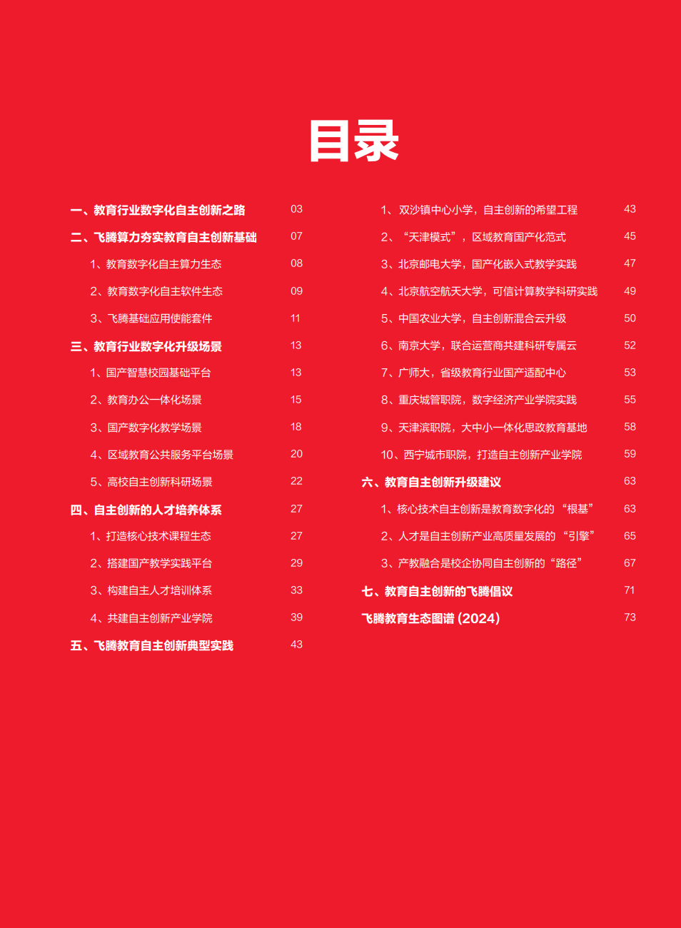 《教育白皮书》全册共分七个章节,从行业趋势、产业生态、解决方案、标杆案例等四个维度进行系统性阐述,围绕教育行业 数字化转型 和 信创人才培养 两大领域,梳理 办公、教学、科研、管理 四大主要业务,聚焦核心应用场景、提炼功能需求,剖析关键技术,形成并推出了生态伙伴广泛参与、共同支撑的全栈教育行业数字化自主创新解决方案。