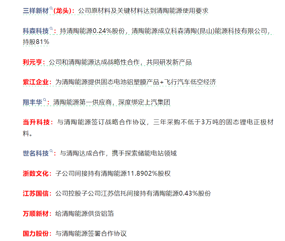 建议:固态电池是电池赛道远期核心迭代路径,产业化循序渐进,推荐宁德时代,固态电解质已布局公司如下:上海洗霸、东方锆业、三祥新材、冠盛股份等。