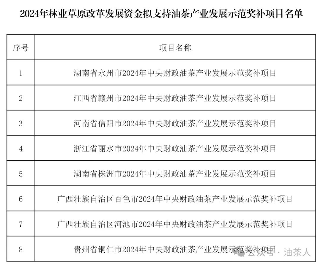 按照2024年中央财政油茶产业发展示范奖补项目申报通知明确的程序,财政部、国家林草局组织专家对申报项目进行了竞争性评审。根据竞争性评审结果,拟将8个项目确定为2024年林业草原改革发展资金支持的油茶产业发展示范奖补项目(详见附件)。
