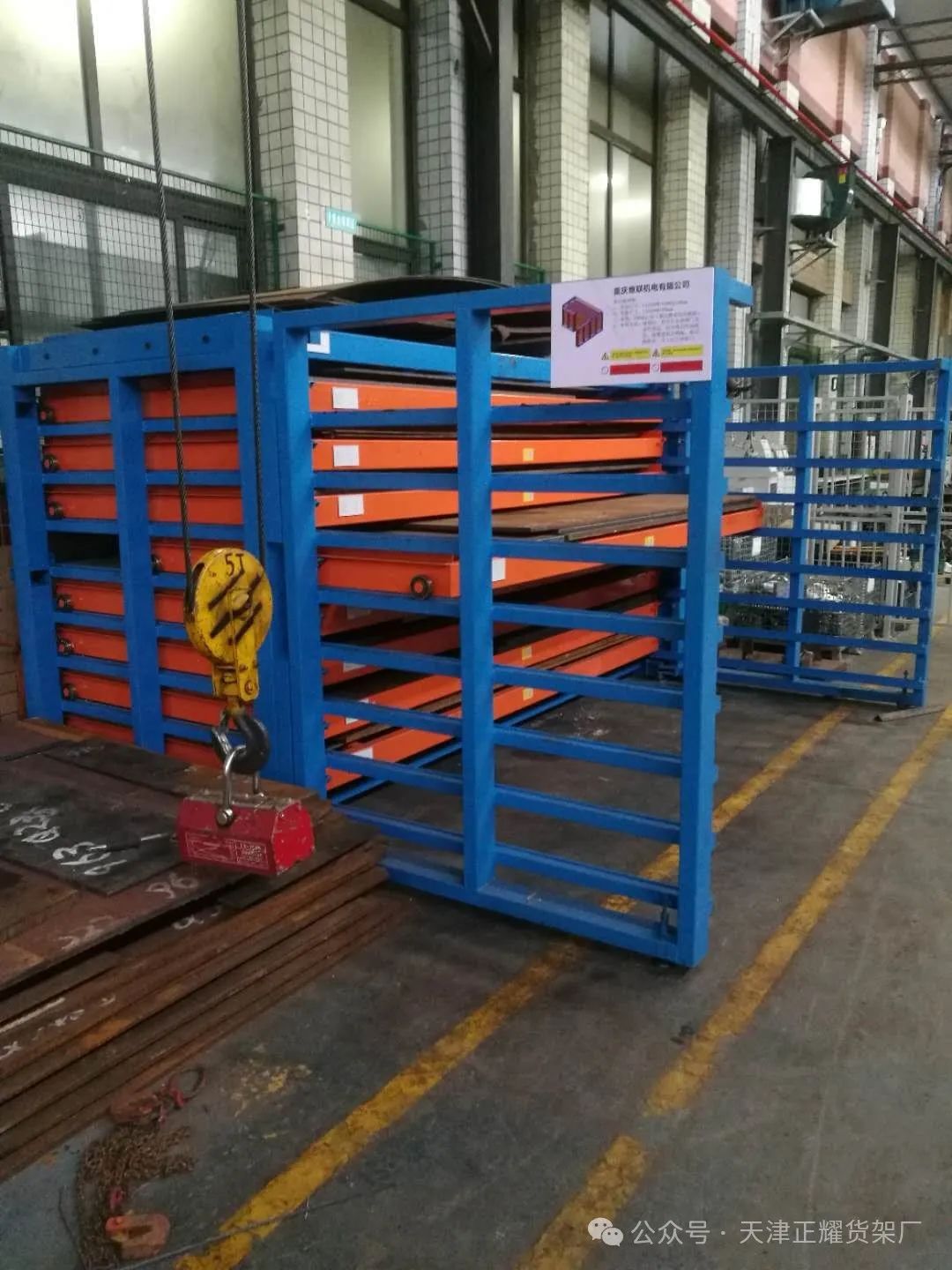 板材货架采用了抽屉式的设计,使得每层抽屉都可以分类摆放不同的板材。这样一来,不仅节省了空间,还使得板材的存取变得很方便。每个抽屉都可以手动摇出,方便行车吸盘夹子吊装板材到激光切割机上完成切割下料工作。这种设计不仅节省了时间,还提高了工作效率。